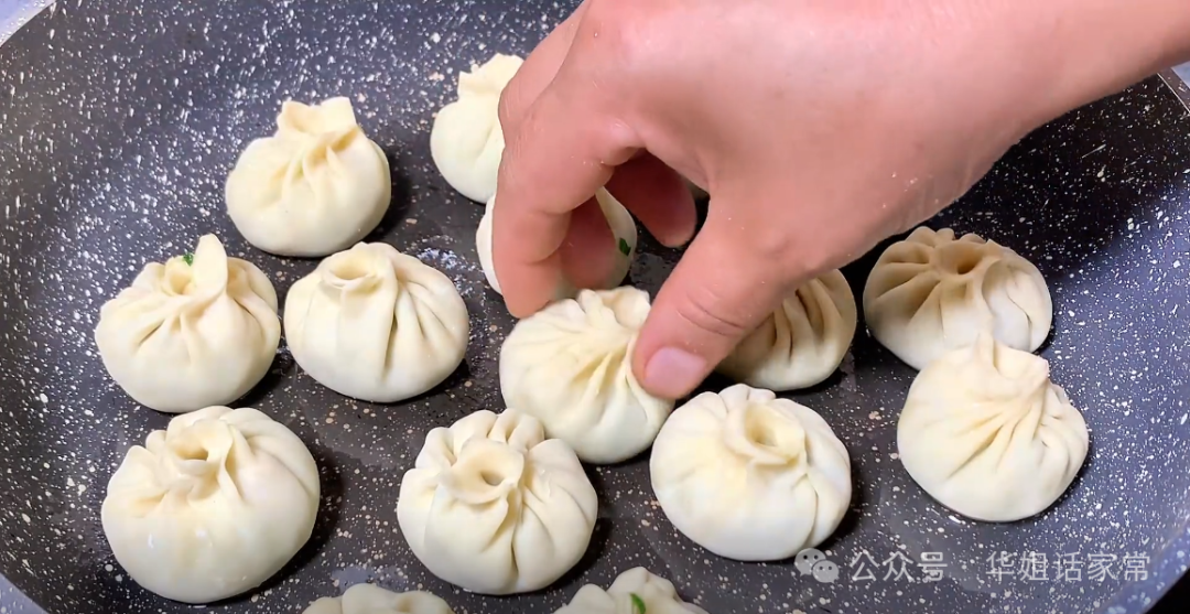在包子底部倒入淀粉水,盖上锅盖,小火继续烙煎7-8分钟,直到水分烙干,底部呈现金黄色即可。这一步是为了让包子底部煎至金黄色,外酥内软。