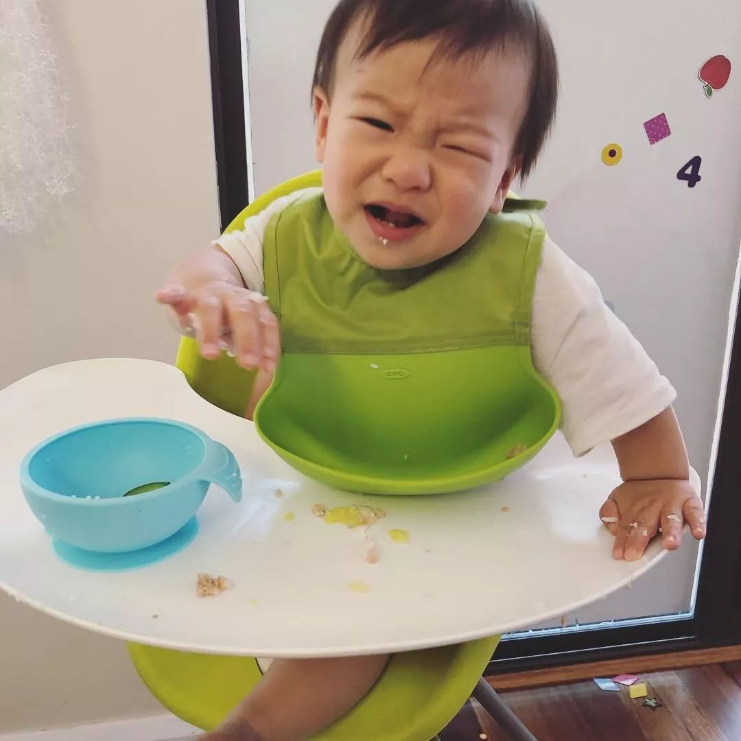 坐在餐椅里的小酒,专注在吃上的时间也非常短。我不希望吃成为一场战争,弄得孩子很不愉快。所以如果他实在不愿意坐了,我就会抱他出来。