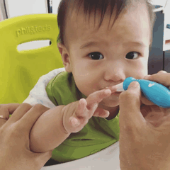 所以用勺子喂的时候,我们也要注意,把勺子放在宝宝嘴边,让宝宝主动来含住勺子,而不是用勺子塞进宝宝嘴里。