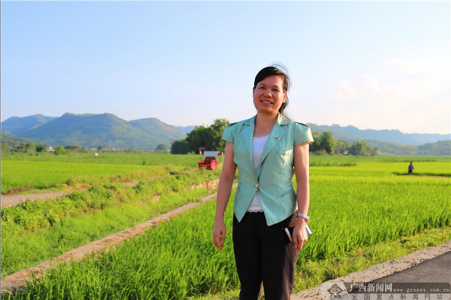 扶绥县扶贫办副主任韦彩武站在富硒大米水田间。在其身后,300亩水田里绿油油的富硒米长势喜人。