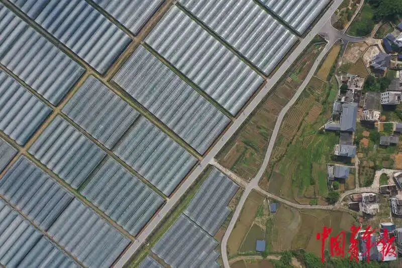 4月29日,江西省赣州市于都县梓山镇,从空中俯瞰富硒蔬菜生态产业园。