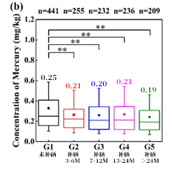 在这些居民中,2.27%的人超过了美国环保署提出的对头发汞的1 mg/kg的安全极限,而没有人超过世卫组织10 mg/kg的耐受极限。未补硒组头发汞含量平均值0.25mg/kg,补硒后头发平均汞含量0.21,0.20,0.21和0.19mg/kg,参与者属于G2,G3,G4,G5。