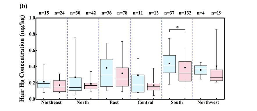 基于目前硒与汞的拮抗反应机制,汞对巯基(-SH)具有较高的亲和力,这种相互作用是影响其毒性的重要因素。在人体中,富含硒的膳食补充剂(如玉米粉、益生菌和酵母)可以代谢为硒化物。由于Se与Hg之间的结合亲和力(常数为1045)比硫与Hg之间的结合亲和力高100万倍,因此Se与Hg之间的相互作用很容易形成Hg-Se配合物。对于长期暴露于低剂量汞的大都市居民,在短期(约3-6个月)硒补充后,硒可恢复硒酶功能和促进汞排泄方面,发挥重要作用。因此,补充硒6个月后的头发样本可以反映中国城市普通人群体内汞的稳定水平。