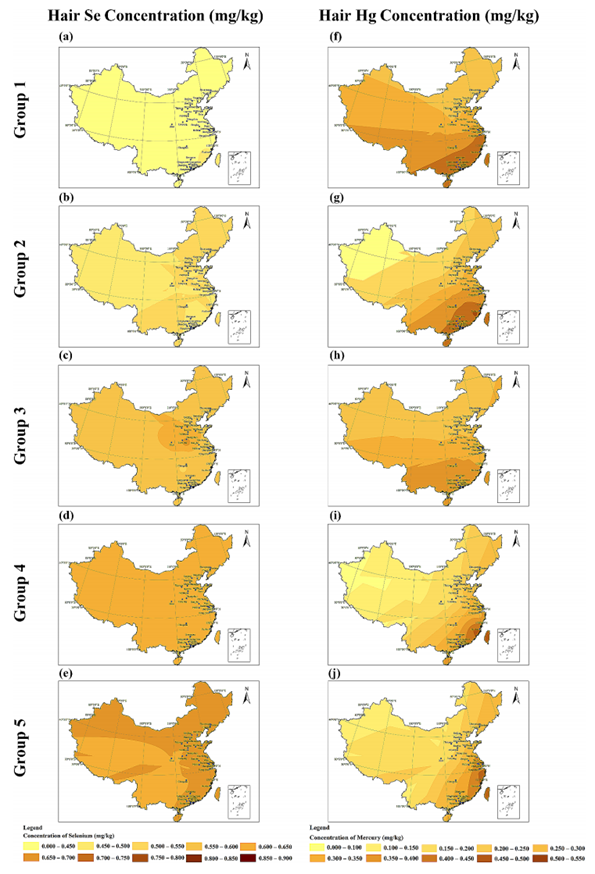 图6:根据硒补充时间分类的中国不同组头发(a-e)硒和(f-j)汞浓度的空间分布