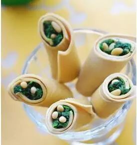 将百叶铺在干净的案板上,在靠自己的一头均匀的铺上菠菜碎,放上松仁慢慢卷起,