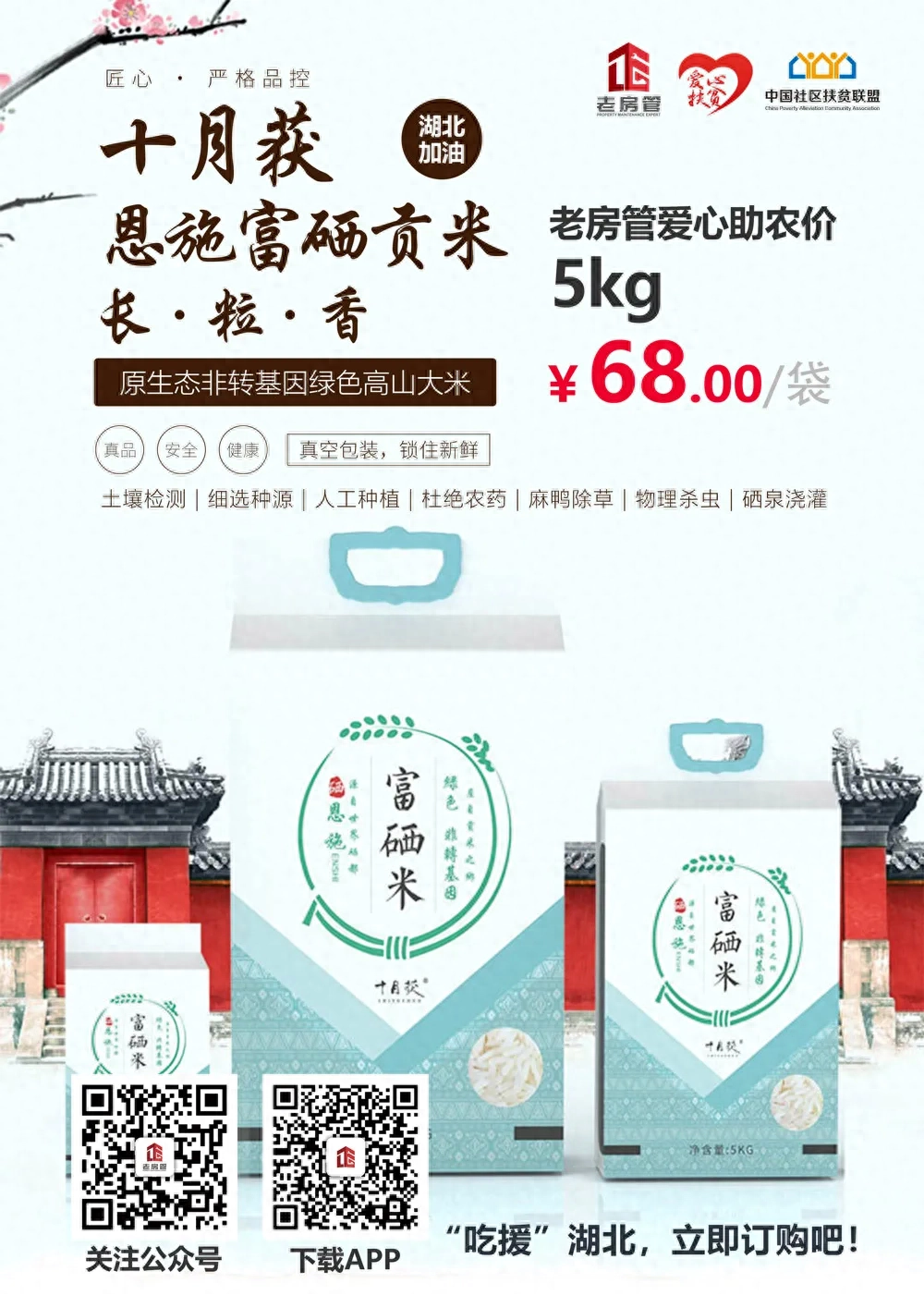 这段时间,为了助力湖北农产品销售,各大媒体电商平台纷纷发力,“吃援”湖北当然也少不了老房管,困难之时,彰显老房管国企担当!为持续做好“社区的力量”消费扶贫攻坚战专项工作,精准帮扶助力,自5月5日起,在老房管平台“社区早市”线上销售十月获·恩施特产富硒贡米,带大家一起品尝来自“世界硒都”的富硒大米,助力湖北,共克时艰!