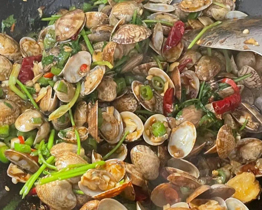 第五步,把调味汁放入锅中炒出香气,然后把花蛤放入翻炒均匀至入味。