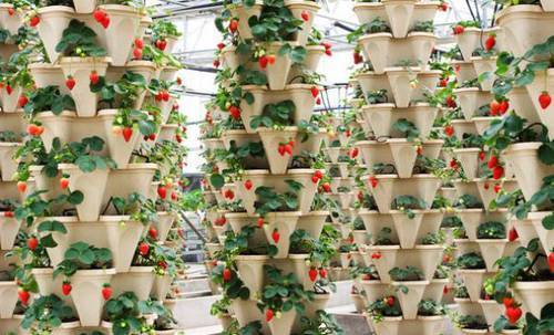立柱式栽培是柱子上安装多个类似花盆的栽培槽,里面放入基质进行栽培。立柱式栽培大多种植无公害草莓,草莓挂果后分布在栽培槽的四周,非常可爱,采摘也非常方便,并可以直接食用。