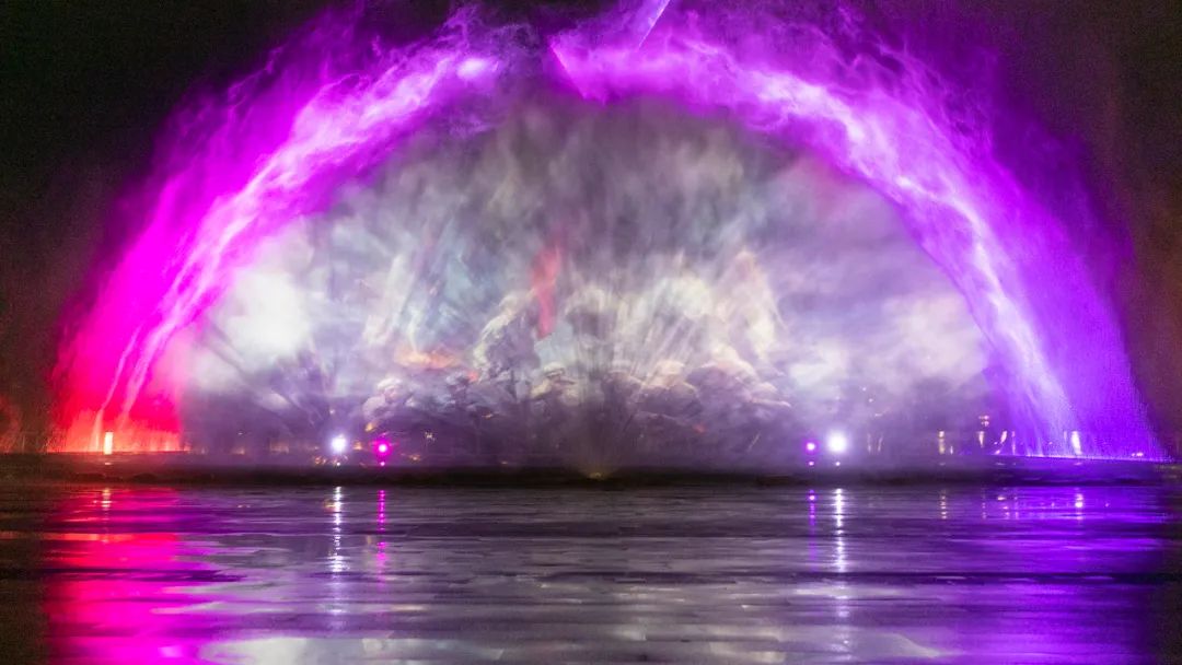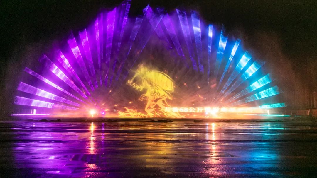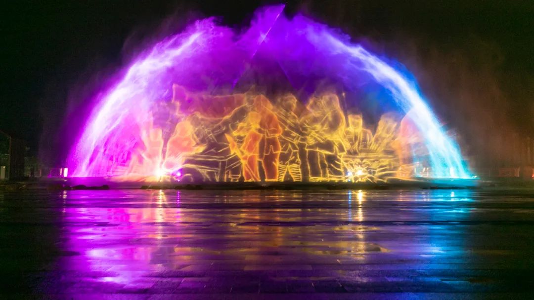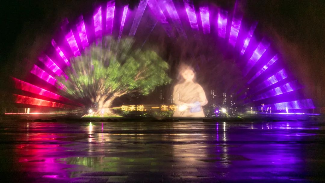 喷泉在夜空中划出一面水幕,光影轮换中,音乐声起,那些长征时期的故事,逐一浮现在光影变幻的水幕之上,仿佛让人穿越到了那个年代,眼前的每一幕画面无不让人动容。