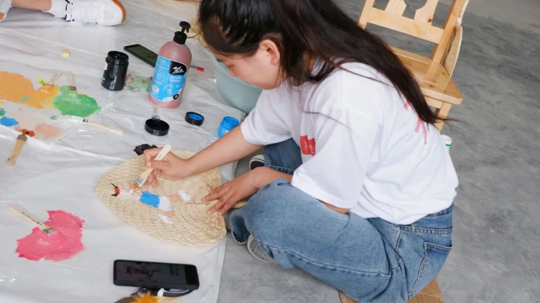制作红船文创产品,结合时代背景绘制进行产品外观设计并进行改良,是本次实践中十分重要的一项任务。团队成员对藤制品进行了绘制,同时结合编织厂的工艺特点、制作原料及最终产品对场地墙面进行自由创作。大家纷纷积极地投入绘画工作,互相配合,成品也得到了藤编厂负责人和手艺人的赞赏,绘制的墙面也得到了当地村民的观看和表扬。