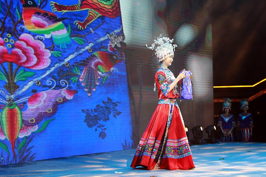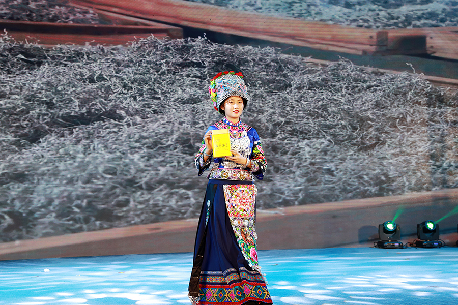 手捧湘西州优质农特产品,身着民族服饰的阿妹准备登场。