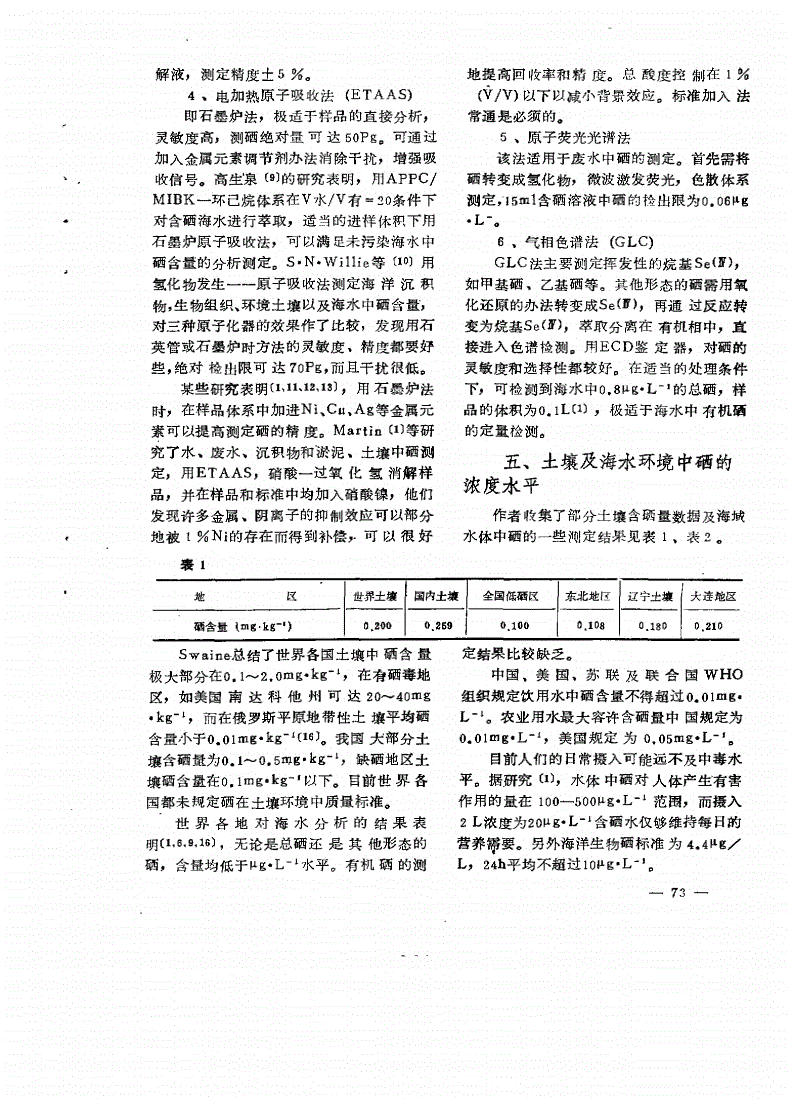 成都理工大学硕士学位论文富硒植物中硒的形态分析研究姓名:****请学位级别:硕士专业:分析化学指导教师:**威20070401摘要富硒植物中硒的形态分析研究作者简介:管凌飞,男,1971年09B出生,2004年09月师从于成都理工大学范必威教授,于2007年06月获硕士学位。摘要硒是人体必须的微量元素之一,对人体的健康具有重要意义。本文主要是针对富硒生物样品中硒的各种形态进行定量分析,以期全面了解富硒植物中硒的形态分布规律,为富硒产品的生产、开发和利用提供有益的参考。在文献工作的基础上,对植物中硒的形态分析流程和样品的预处理方法进行了改进和优化:采用了D101大孔吸附树脂替换XAD.2树脂来消除可溶有机质对测定的干扰:确定了水提取植物中无机硒的具体操作条件和流程;采用了先微波密闭消解后又湿法消解处理样品使加标回收率明显提高(达97%);选择了酸式还原法将Se(VI)还原为se(IV)。本文的研究结果表明:富硒环境下的大蒜、螺旋藻与同类的普通大蒜和螺旋藻相比,除在有机硒和不溶态硒占总硒的百分率较高外,在无机硒、Se(IV)、SefvD以及可溶态硒、可溶态有机硒均较低;硒主要是以有机硒的形式存在,占总量的93%以上;无机硒又主要以se(iv)的形式存在,Se(VI)的含量不到总硒的O.6%;样品植物体内的可溶态硒约占总硒的70%左右,其中可溶态有机硒占总硒的60%~65%,可溶态有机硒占可溶态硒的90%以上;富硒植物在富硒土壤或外加硒培养的环境下,在硒的富集和转化中,外界的无机硒基本上是转化为有机硒,对植物中的无机硒特别是Se(vI)的累积效应不明显,即Se(VI)的含量随外加硒的富集无明显增高的趋势;不同类富硒植物对硒的富集程度也存在着差异,符合植物由于品种和生长环境等不同的实际情况引起的的自然规律。