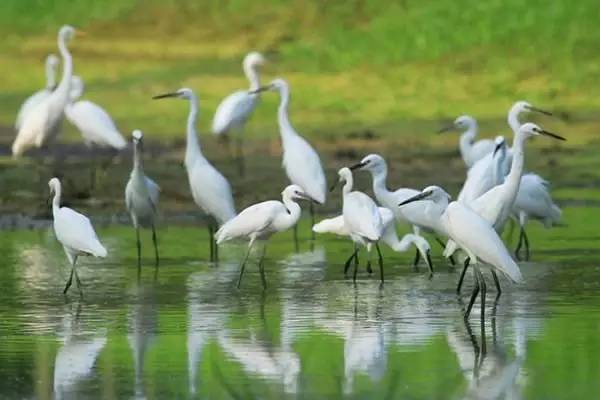 鹭鸟天堂草木参天,郁郁葱葱,适合各种鸟类聚居,主要鸟类有白鹭、夜鹭、灰鹭等。每年四至六月为鸟群聚居的高峰期,约有上万只鹭鸟在这里栖息繁殖,鸟儿成群结队在树木上空翱翔,千姿百态,十分壮观,令路人伫足,观者自醉。