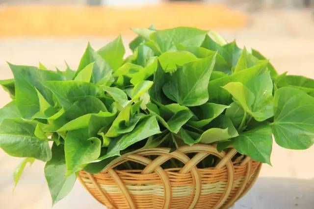 红薯叶,即秋天红薯成熟后地上秧茎顶端的嫩叶。测试表明,每百克鲜红薯叶含蛋白质2.28克、脂肪0.2克、糖4.1克、矿物质钾16毫克、铁2.3毫克、磷34毫克、胡萝卜素6.42毫克、维生素C0.32毫克。将其与常见的蔬菜比较,矿物质与维生素的含量均属上乘,胡萝卜素含量甚至高过胡萝卜。