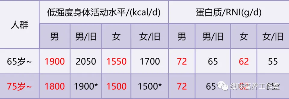 65岁以上老人的能量需要量下降了150kcal/d,大约等于大半碗米饭的热量。男性75岁以上高龄老人与旧版80岁以上高龄老人的能量需要量相比,也下降了100kcal/d,大约是每天少吃半碗米饭的热量。女性75岁以上高龄老人的能量需要量没有变化。