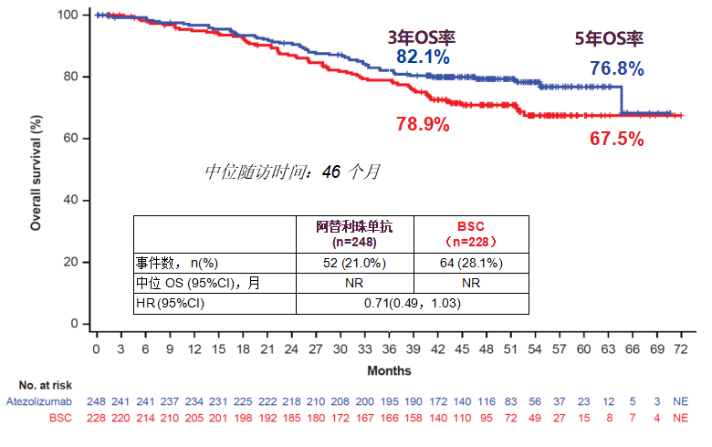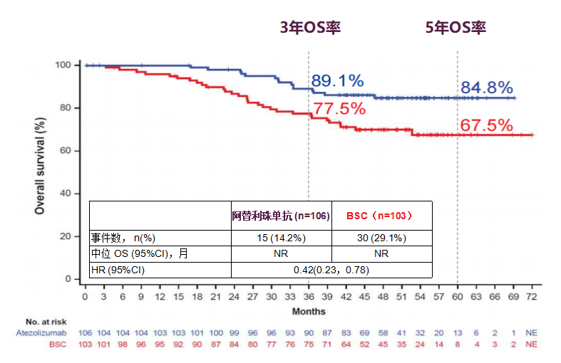 图2,3 IMpower010研究PD-L1 TC≥1%与PD-L1 TC≥50%患者人群OS数据曲线